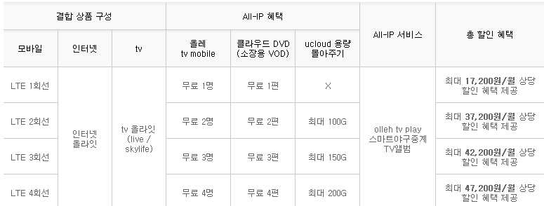 KT 결합상품 All-IP 올라잇은 KT핸드폰, 그중에서도 요즘 많이들 사용하고 계시는 LTE를 사용하기만 해도 큰 혜택을 받을 수 있는 상품이랍니다. 정리된 아래의 표를 보면서 설명해드리겠습니다.