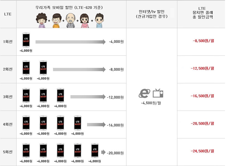 위의 그림은 LTE 620요금제를 사용하신다는 전제하에, 가족들과 뭉치면 뭉칠수록 커지는 요금할인 혜택을 보실 수 있습니다. 점점 할인혜택이 커지는 게 보이시죠? 가족끼리 꼭 같은 요금제를 사용하여야 하는 게 아닙니다.