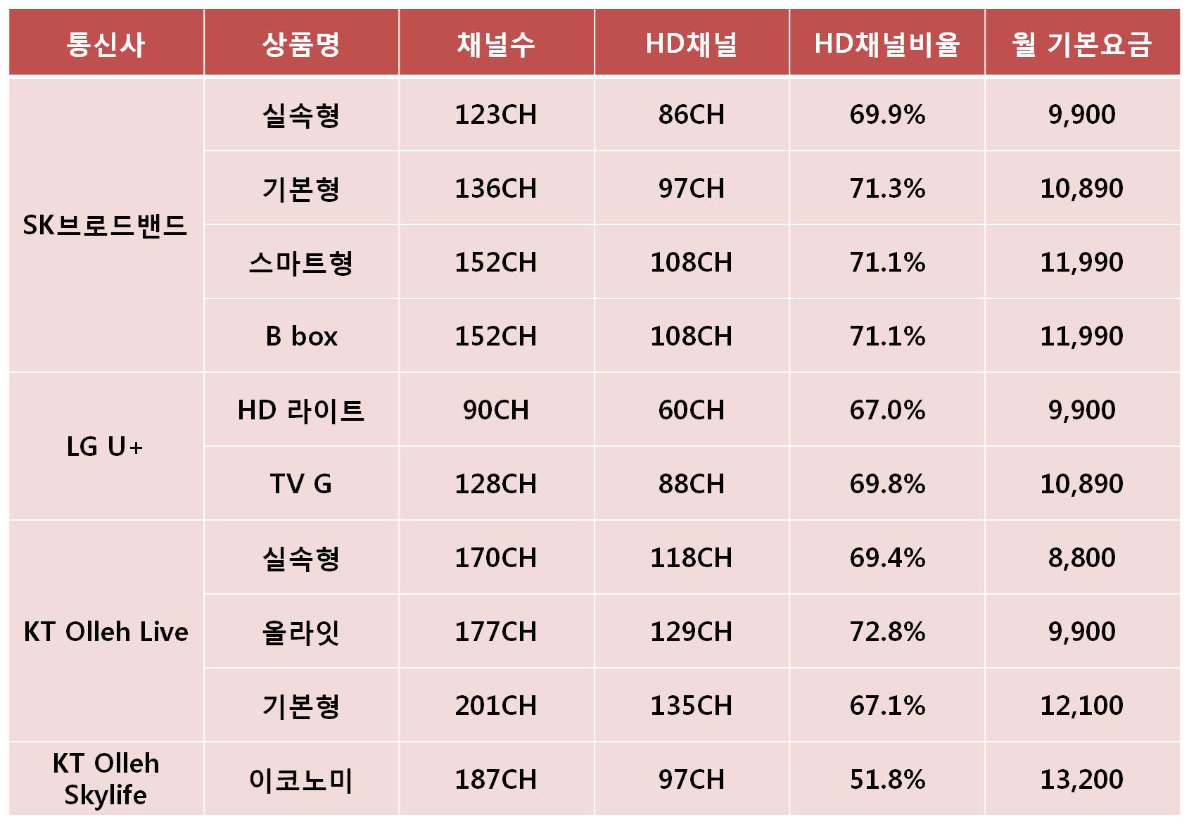대체적으로 HD채널 제공면에서는 비슷하지만 채널수와 가격을 비교해보며 고객님께서 본인에게 맞는 요금제와 통신사를 선택하시면 좋을 것 같습니다. 거기다가 한가지 팁을 더 드리자면 고객님께서 사용하고 계시는 핸드폰 통신사와 동일한 인터넷통신사를 가입한다면 결합할인도 있다는 점 잊지마세요 ^^