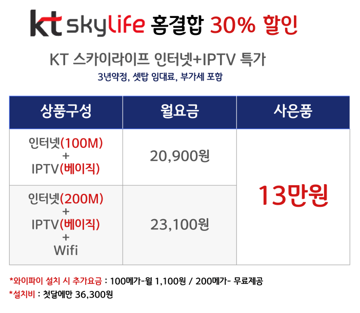 | 제목 | KT skylife 인터넷+TV 30% 할인상품 100메가 200메가 선택팁 |