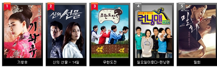 꾸준히 큰 사랑을 받고 있는 기황후가 1위를 차지했네요. 배우 하지원의 인기 덕분인지 꾸준히 안방에서 큰 관심을 모으고 있습니다. 그리고 예능프로그램으로는 꾸준한 사랑을 받고 있는 무한도전과 런닝맨은 순위에 역시나 있습니다. 국민MC 유재석의 힘이기도 하고 개성 있는 출연진들 덕에 순위에서 벗어나질 않는듯 합니다 ^^