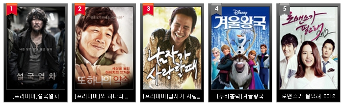 극장 종영 후 1개월내에 Btv에서 서비스가 되는 정액제 상품인 프리미어 VIP라운지의 인기가 큰가봅니다. 1~3위까지 모두 프리미어 서비스에서 제공하는 영화네요. 그리고 국내외에서 인기가 많았던 설국열차를 비롯하여 실화를 바탕으로 한 또 하나의 약속, 그리고 배우 황정민의 열연으로 인기가 많았던 남자가 사랑할 때가 순위권에 있습니다.