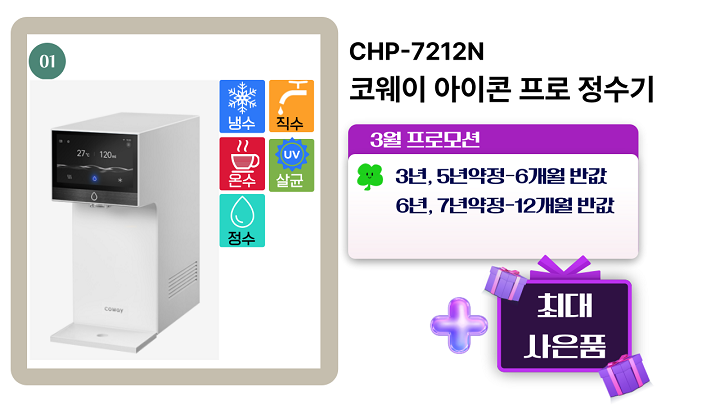 1) 코웨이 아이콘 프로 정수기(CHP-7212N) 색상: 페블 블랙/포슬린 화이트/브론즈 베이지/아이시 블루/아이언 실버