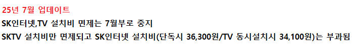 SK브로드밴드 인터넷, TV 설치비(출동비) 면제 이벤트가 오늘부터 진행됩니다. 아래 내용을 잘 확인해 보시고 SK브로드밴드 인터넷, TV를 가입하실 고객님들께서는 이번 이벤트 기회를 놓치지 마세요!! 적용대상: 25년 5월 21일 ~ 6월 30일 가입 건. - 인터넷 설치비 면제 세부사항 SK인터넷 가입시 인터넷설치비 36,300원 면제 SK인터넷+BTV 가입시 인터넷+TV설치비 56,100원 면제 ( SK인터넷+ BTV POP 특가상품의 경우도 인터넷+TV 설치비 56,100원 면제 ) - SK,LG,KT 통신3사 인터넷가입 세부 상품별 요금, 사은품이 궁금하시다면 - SK인터넷 품질은 그대로!! 요금은 가장 저렴한 특가로!! |