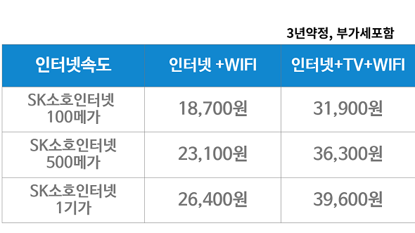 100메가 → SK소호인터넷 11만원 / LG소호인터넷 20만원 500메가 / 1기가 → SK소호인터넷 17만원 / LG소호인터넷 23만원