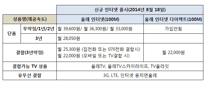 KT올레 인터넷이 2014년 8월 18일부터 큰 폭으로 변경되어 내용 안내해 드립니다.