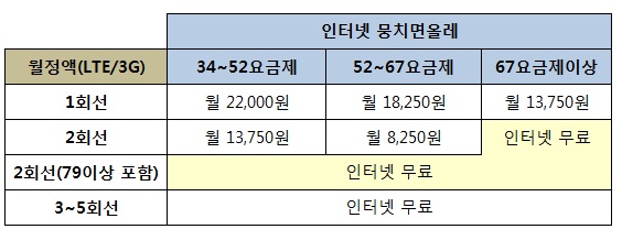 또한 기존의 ALL-IP 올라잇이라는 상품이 인터넷 뭉치면올레로 새로 개편되어 혜택이 강화되었습니다. 핸드폰 67요금제 이상 2회선 결합 시 인터넷을 무료로 사용할 수 있으며 SK와 비슷하게 3회선을 결합하여 인터넷을 무료로 사용할 수 있게 되었습니다. LTE뭉치면올레의 경우 LTE폰 사용자에 대해서만 할인혜택이 주어졌는데요 인터넷 뭉치면올레의 경우는 3G사용자에게도 동일한 혜택이 주어집니다.