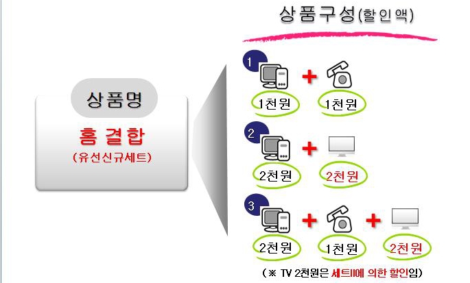 - 초고속+전화+IPTV : 초고속/IPTV 기본료 2천원할인, 070전화 기본료 1천원