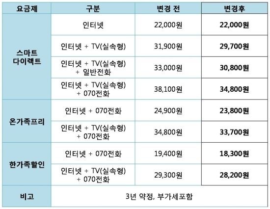 - 초고속+전화 : 기본료 1천원 할인(전화는 070전화에 한하여 할인 적용)