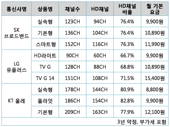 [SK브로드밴드 BTV, KT 올레 IPTV, LG U+ TV 주요 상품별 비교]
