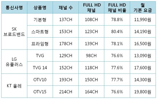 [SKTV vs LGU+TVG vs KT IPTV 비교 : 주요 상품별] (3년 약정, 부가세포함)