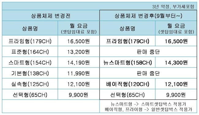 1. SK브로드밴드 BTV 9월기준 상품 및 요금체제 변경표