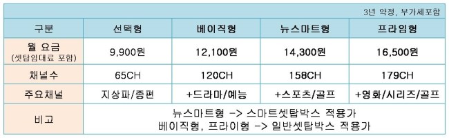 기존보다 더욱 심플해진 SK브로드밴드 BTV. ① 실속형, 표준형, 기본형이 사라지고 실속형과 동일한 요금의 베이직형 출시 ② 베이직형 이상 가입 시 일반셋탑박스, 스마트셋탑박스 둘 중 한가지 선택 가능. ③ 뉴스마트형은 기존 스마트형대비 큰 차이 없음(채널4개증가,요금110원 인상) ④ 기존 프라임형과 선택형은 변경 없이 그대로.