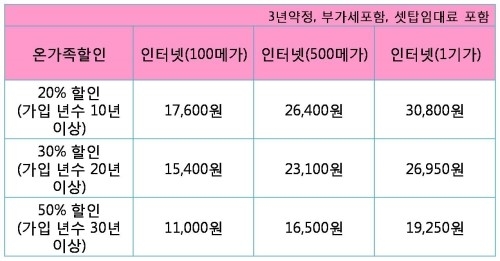 SK휴대폰을 오랫동안 사용하신 분들이라면 온가족할인을 선택하시는 것도 좋습니다. 가입 년수에 따라 20%~50%까지 유무선 동일하게 할인을 받아보실 수 있습니다.