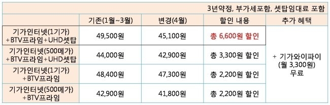 ※ SK기가인터넷 4월 핵심요금제 내용 안내 1) 1기가 + BTV프라임형 + UHD셋탑 동시 가입 시 기존(1월~3월) 2,200원 할인 -> 변경(4월) 총 6,600원의 요금 할인 2) 500메가 + BTV프라임형 + UHD셋탑 동시 가입 시 기존(1월~3월) 2,200원 할인 -> 변경(4월) 총 3,300원의 요금할인