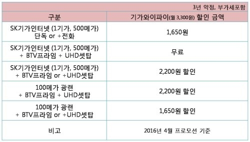 ※ SK 기가와이파이 무료 및 할인 행사 대상 (2016년 4월 ~ 마감 시까지) 1) 적용요금제 - 온가족프리, 스마트다이렉트, 온가족할인 요금제
