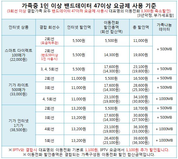 : 인터넷요금할인 + 이동전화 할인 + 가족나눔 데이터 최대 1,000MB 혜택 추가