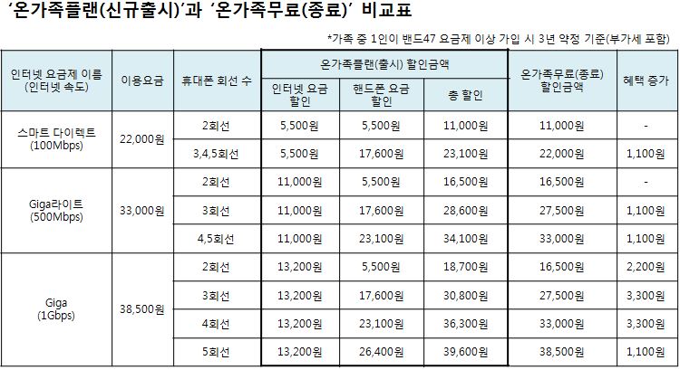 기존 온가족무료는 가족회선을 결합하여 인터넷 요금이 무료가 되는 상품이었으나,