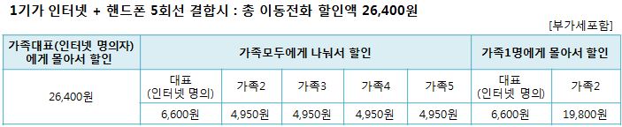예를 들어 1기가 인터넷과 핸드폰 5회선을 결합하면 총 이동전화 할인액이 26,400원 인데요,