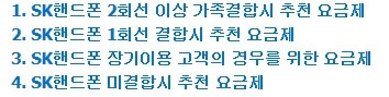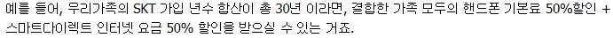 3. SK핸드폰 장기사용고객 이라면? SK핸드폰을 오랫동안 사용하신 분들을 위한 온가족할인 요금제! 가입 년수에 따라 20~50%까지 유무선 동일하게 할인 받으실 수 있는 알뜰한 상품입니다.