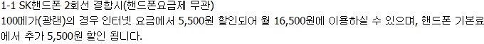 1-2 SK핸드폰 2회선 결합시(밴드59, LTE75이상 1인 사용시), SK핸드폰 3회선 결합시(요금제 무관) 100메가(광랜)의 경우 인터넷 요금에서 5,500원 할인되어 월 16,500원에 이용하실 수 있으며, 핸드폰 기본료에서 추가 14,300원 할인 됩니다. 1-3 SK핸드폰 3회선 결합시(밴드47, LTE62이상 1인 사용시) 100메가(광랜)의 경우 인터넷 요금에서 5,500원 할인되어 월 16,500원에 이용하실 수 있으며, 핸드폰 기본료에서 추가 17,600원 할인 됩니다.