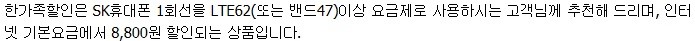 2. SK핸드폰 1회선만 쓰신다면? 1회선 결합시에는 온가족프리와 한가족할인 요금제로 가입하실 수 있기 때문에 둘다 안내해드리겠습니다.
