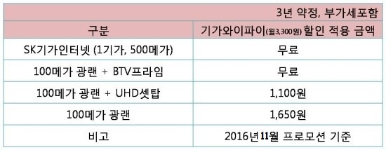 SK브로드밴드 핵심요금제 [기가인터넷(500메가, 1기가) + BTV프라임형 + UHD셋탑] 가입 시 기가인터넷(500메가, 1기가) : 1,100원 할인 BTV : 1,100원 할인 박스 임대료 : 1,100원 할인(※ 할인 대상 요금제 : 온가족프리, 스마트 다이렉트) ======================================== 총 3,300원 할인