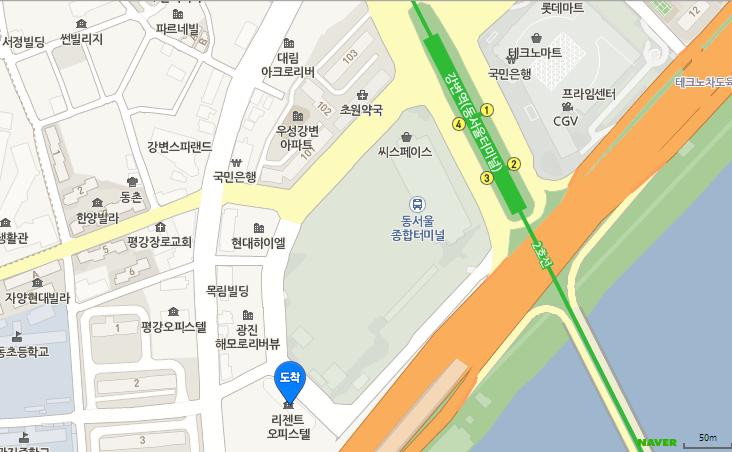 지하철 2호선 강변역 4번출구 도보 5분거리