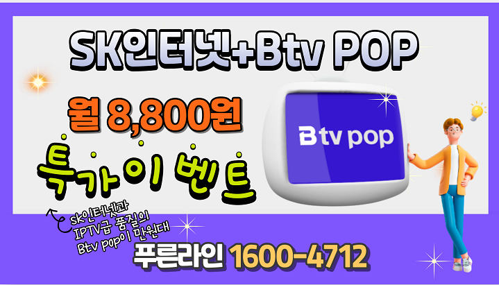 | 제목 | SK브로드밴드 인터넷 + BTV POP(팝)180 특가 월 8,800원~ 가성비 있는 SK알뜰인터넷 TV 상품으로 추천!! |